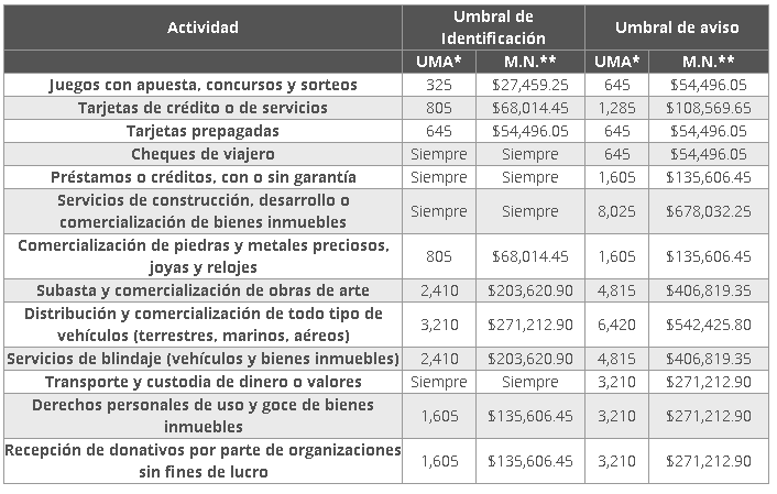 A continuación un cuadro con las actividades vulnerables comprendidas en el artículo 17 LFPIORPI y los montos considerados para estar obligados a presentar el aviso.